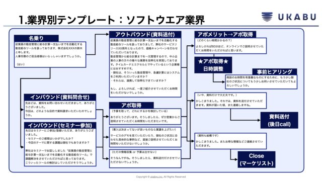 UKABUはそのような皆さまの準備のお手伝いができるよう、営業スクリプトの作成ノウハウを業界別のテンプレートとともにご紹介しております。このテンプレートを自社のオリジナルのスクリプトの作成や、改善に活用いただけると思います。該当する業界の方はダウンロードしてすぐに現場でご活用いただけます。