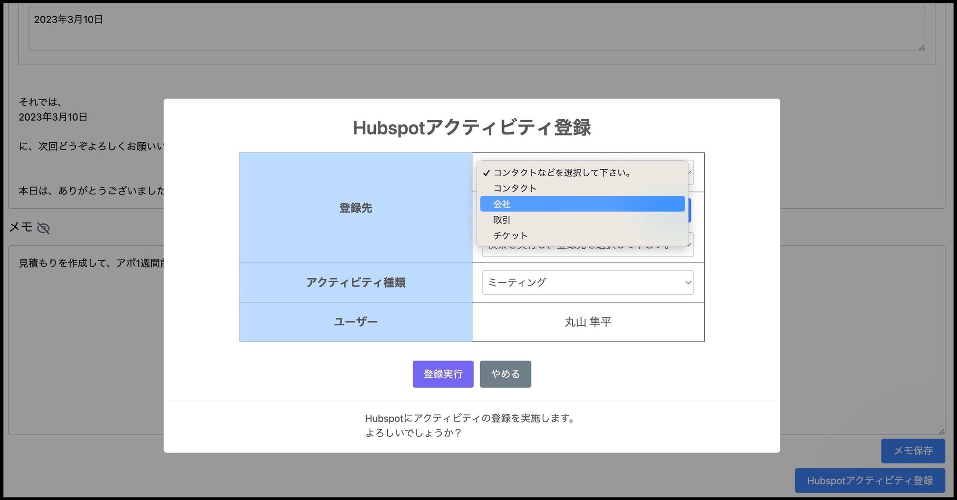 2.Hubspot に活動登録したい登録先を、取引先、商談、取引先責任者、リードなどから選択し、活動目的も選択し、「登録実行」ボタンを押す