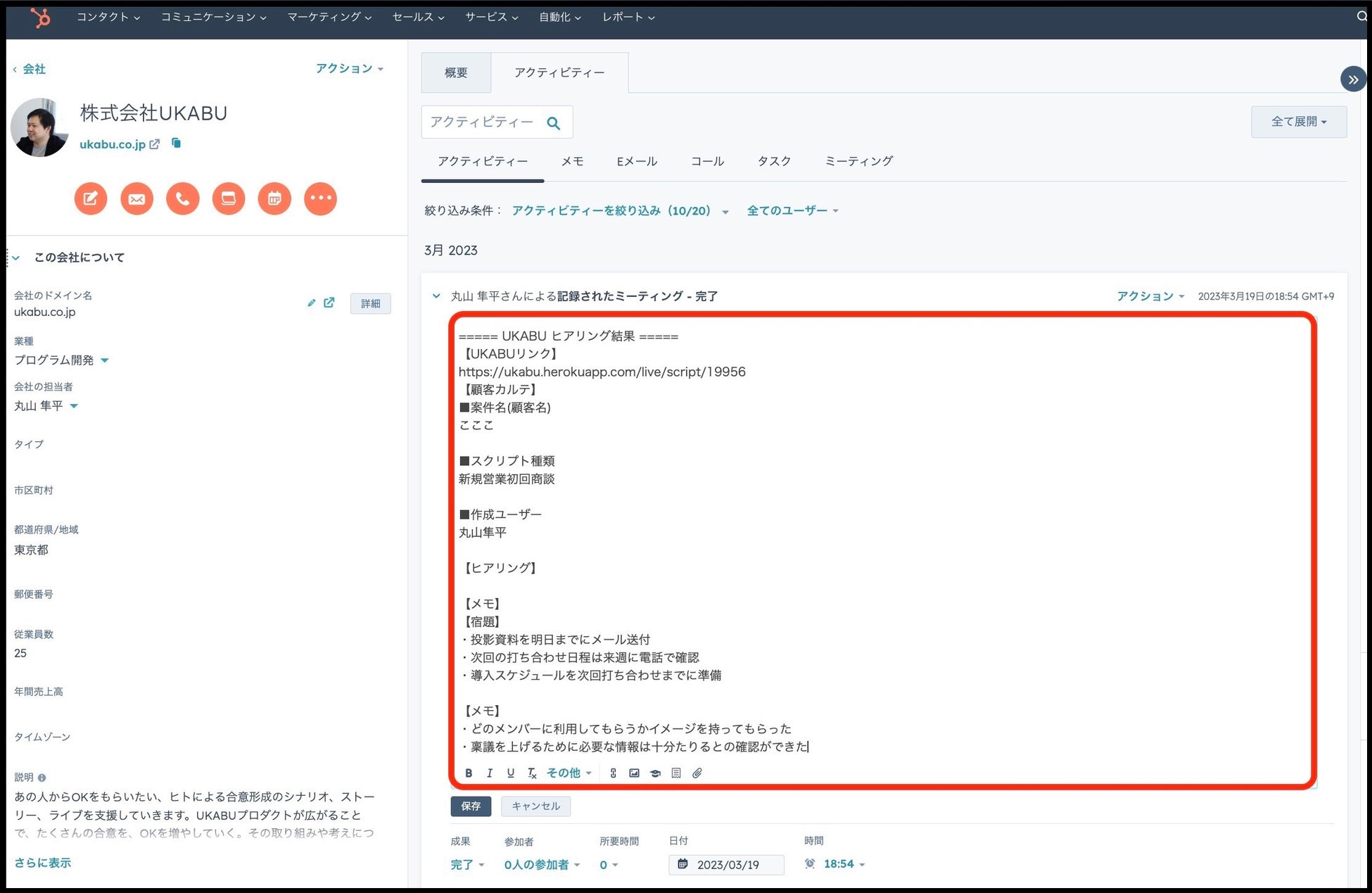 1.UKABUを見ながら電話や商談を行った後、「Hubspot 活動登録」ボタンを押す