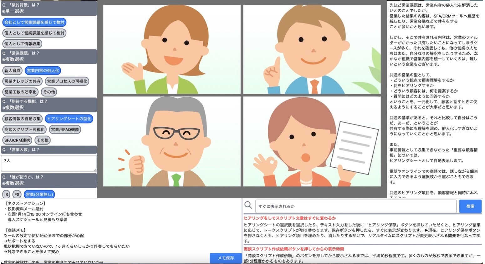 商談の際に利用する「ヒアリングシート」「商談スクリプト」「営業用FAQ」「メモ」が一度に表示され、オンライン商談をしながら、必要な情報を簡単に表示、記入、選択、検索できるようになります。