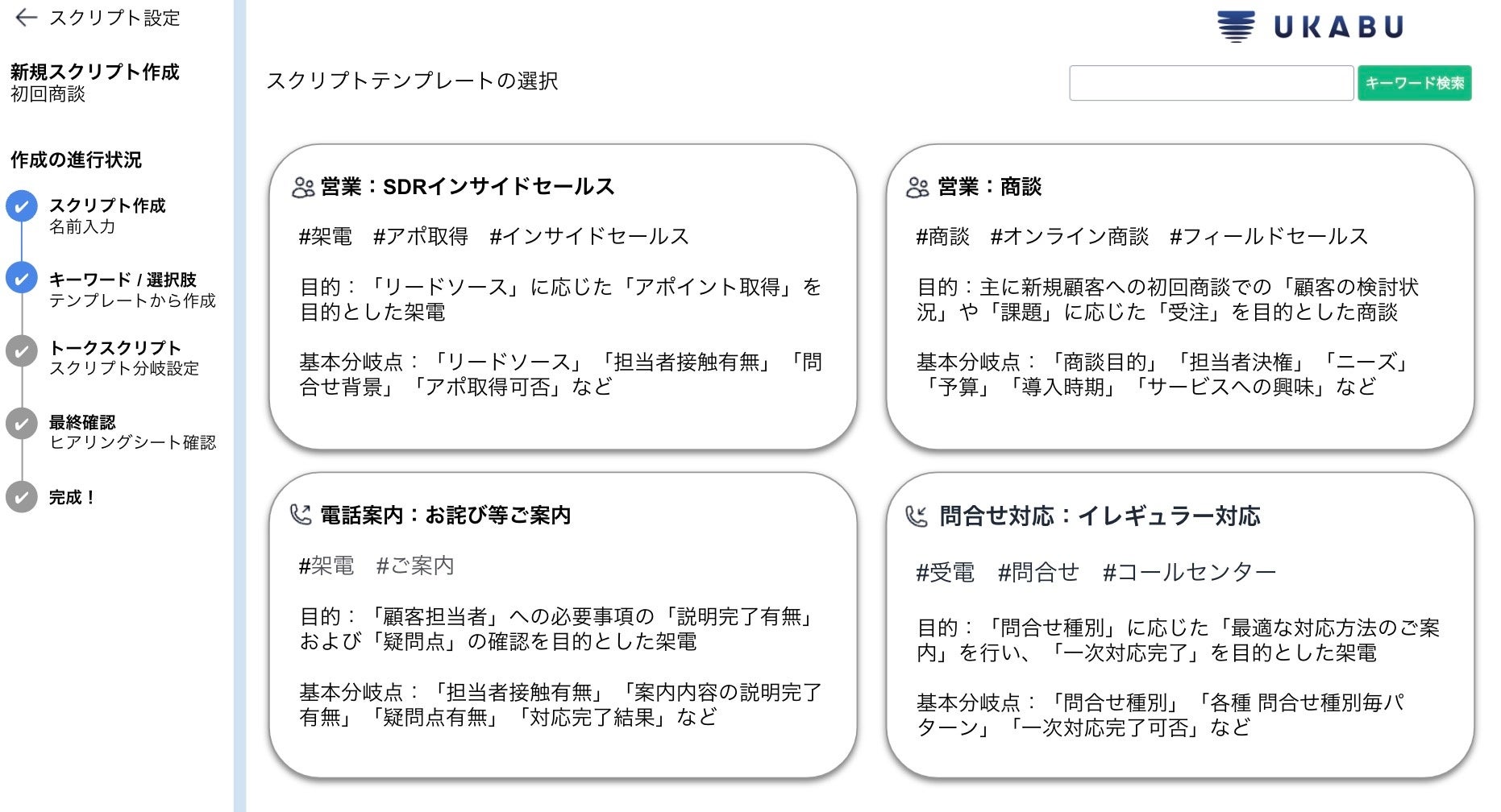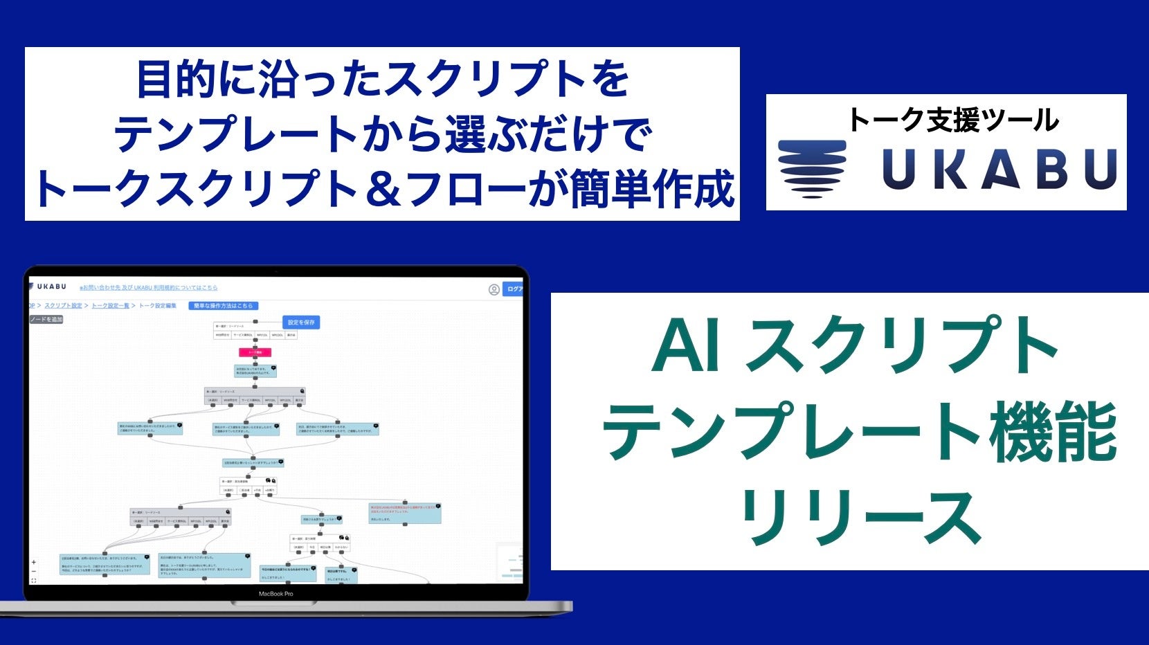 トーク支援ツールUKABU「AI スクリプト テンプレート機能」リリース!目的に沿ったスクリプトをテンプレートから選ぶだけで、トークスクリプト&フローチャートが作成可能に!