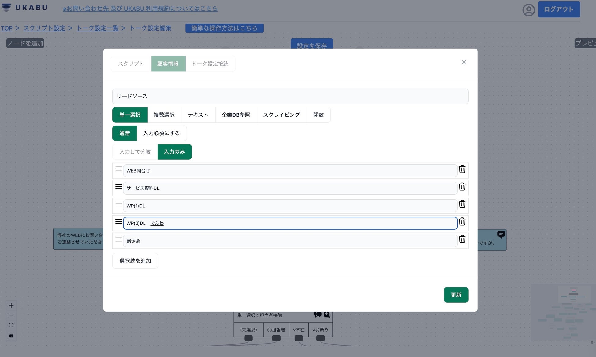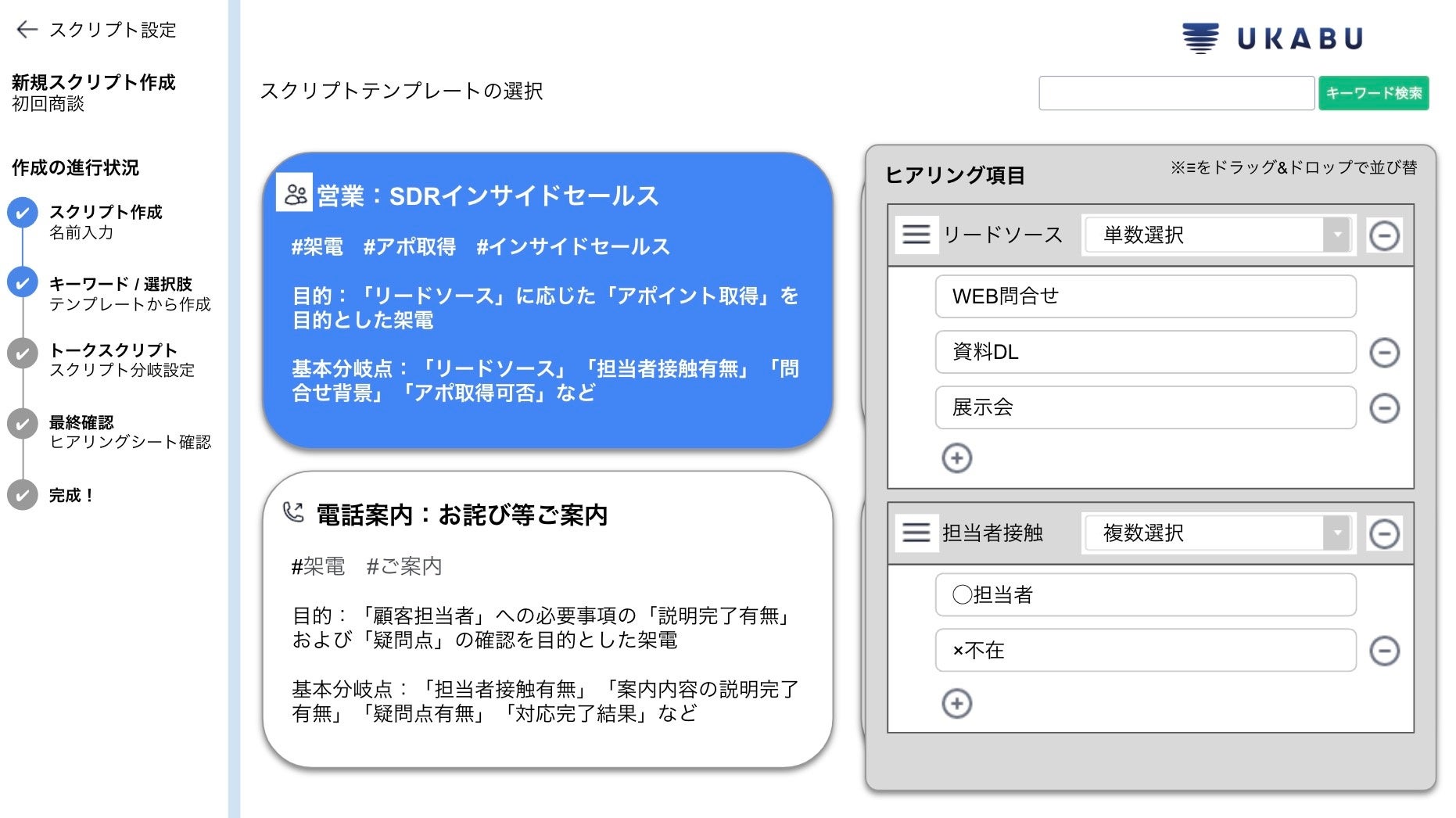 大手企業やコールセンター、商社などでは、新商品のリリースや新たな顧客対応方針の変更、入退社や組織変更も多く、トークスクリプトを新たに設計する頻度が多く、このスクリプト設計をUKABUで簡単にすることができないか、というご要望が多くなっておりました。